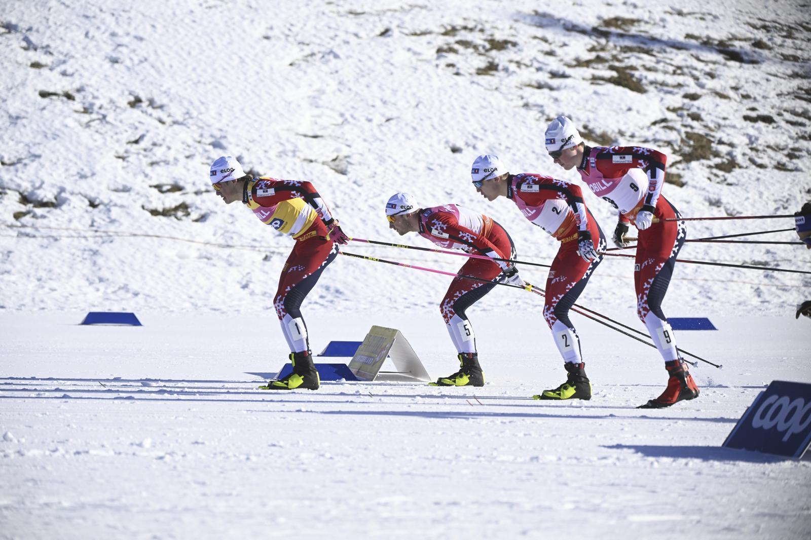 노르웨이의 크로스컨트리 스타 요한네스 회스플로트 클레보(왼쪽)가 지난해 2월 열린 국제스키·스노보드연맹(FIS) 월드컵 남자 스프린트 클래식 경기에서 동료들과 함께 레이스를 펼치고 있다. 팔룬=AP 뉴시스
