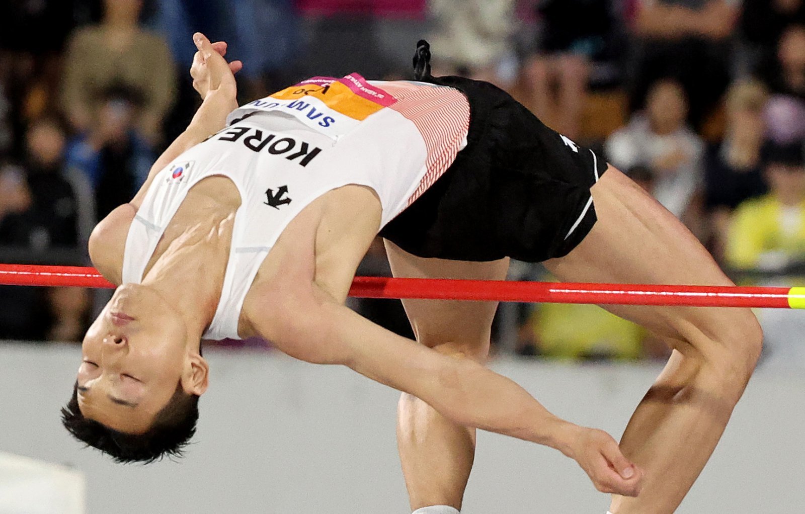 우상혁(용인시청)이 29일 경북 구미시민운동장에서 열린 2025 구미아시아육상선수권대회 높이뛰기 결선 2m23 1차시기 점프에 성공하고 있다. 2025.05.29. [구미=뉴시스]