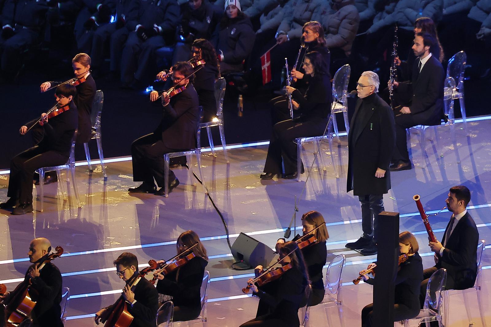 테너 안드레아 보첼리가 6일 오후(현지시간) 이탈리아 밀라노 산시로 올림픽 스타디움에서 열린 2026 밀라노·코르티나담페초 동계올림픽대회 개회식에서 성화 봉송에 앞서 공연을 선보이고 있다. 2026.2.7.3뉴스1
