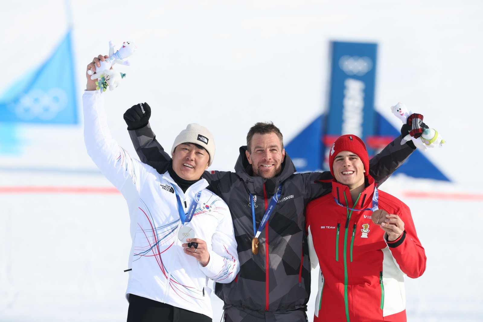 스노보드 남자 평행 대회전 은메달을 확보한 김상겸이 8일(현지시간) 이탈리아 리비뇨의 스노파크에서 열린 2026 밀라노·코르티나담페초 동계올림픽 스노보드 남자 평행 대회전 시상식에서 기뻐하고 있다. 왼쪽부터 김상겸, 베냐민 카를(오스트리아), 테르벨 잠피로프(불가리아). 2026.2.8 (리비뇨=뉴스1)