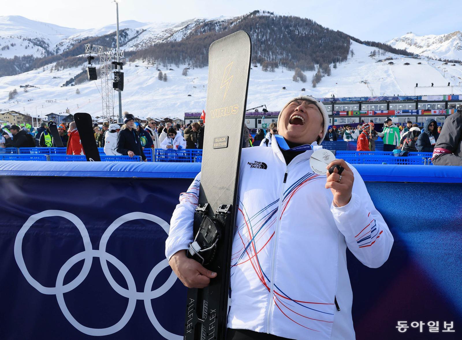 2026 밀라노-코르티나담페초 겨울올림픽에 출전한 한국 선수단 중 가장 나이가 많은 김상겸(37)이 8일 이탈리아 리비뇨 스노파크에서 열린 스노보드 남자 평행대회전 시상식 때 은메달을 들어 보이며 포효하고 있다. 리비뇨=전영한 기자 scoopjyh@donga.com