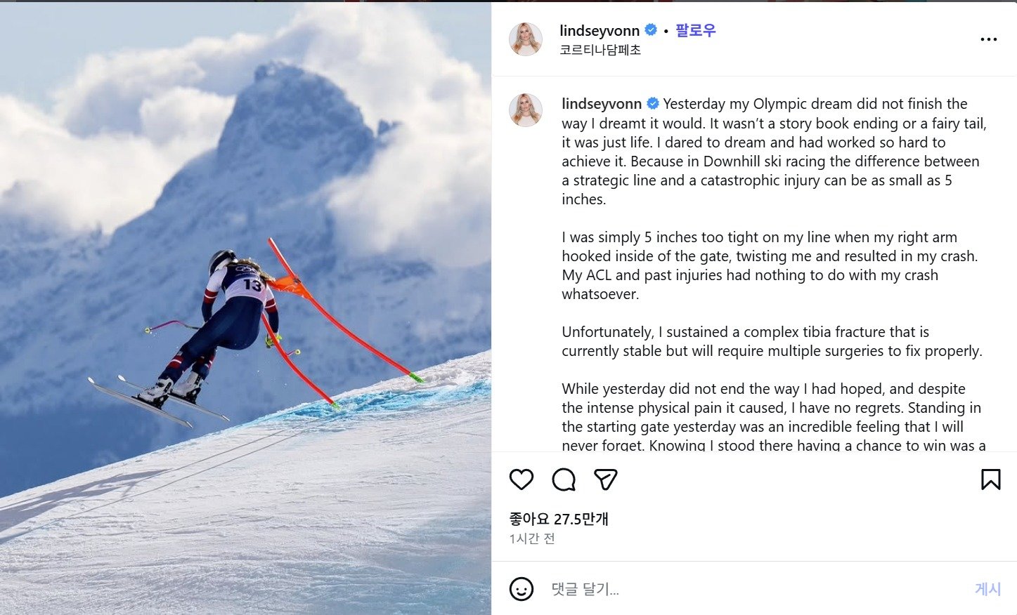 2026 밀라노·코르티나담페초 동계 올림픽에 출전한 알파인스키 선수 린지 본(42·미국)이 부상으로 인한 몸 상태와 심경을 알리는 게시물. 린지본 인스타그램 갈무리