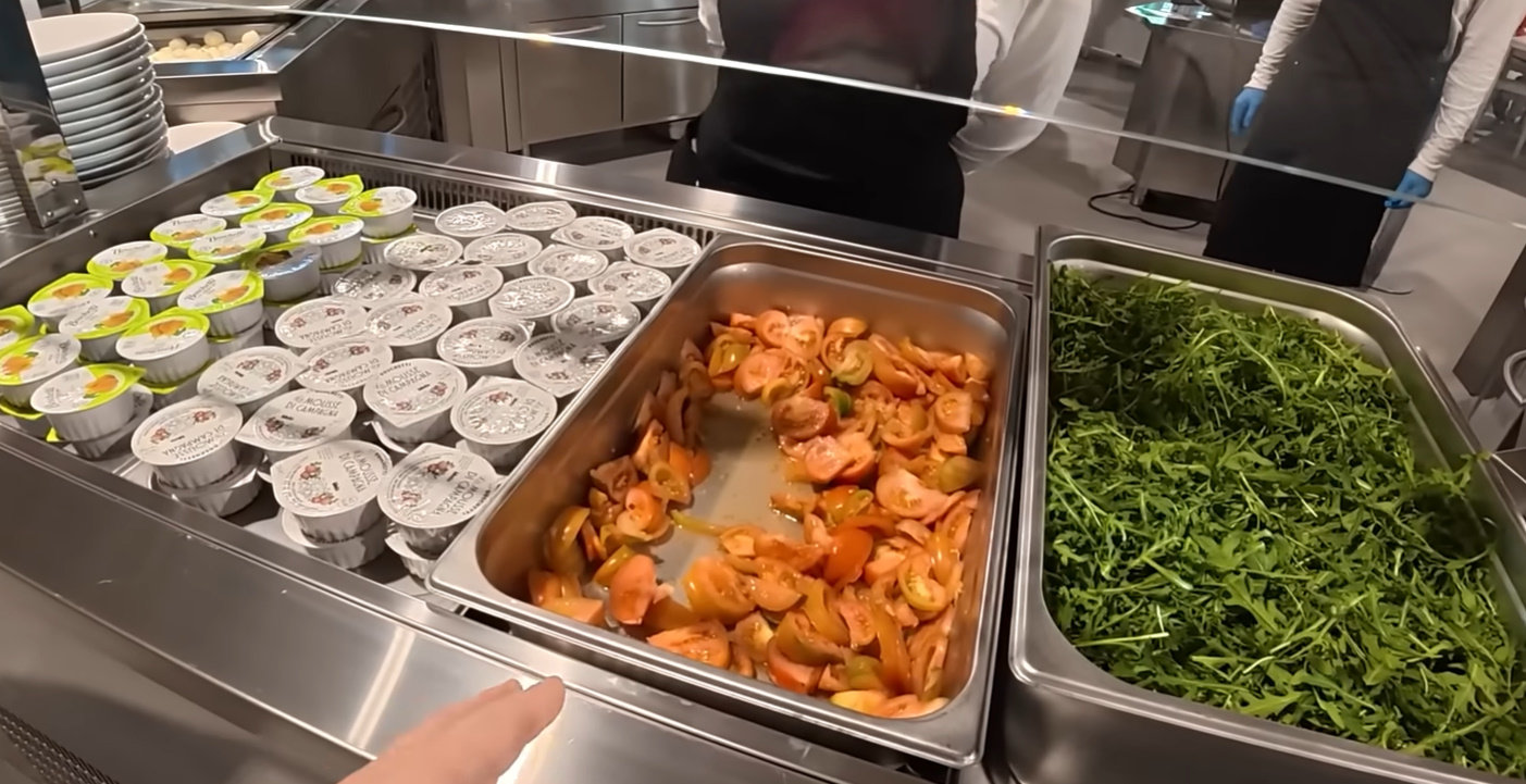 밀라노-코르티나담페초 겨울올림픽 선수촌 식당의 메뉴. 모차렐라 치즈와 달걀 등이 있다. 유튜브 콰쿄기하지만 곽윤기는 식당에 들어서자 마자 젓가락이 없다는 것을 발견한 뒤 “(아시아의) 면 요리가 없는 것 같다”고 예상했다. 과일은 사과와 배, 귤만 있었다. 과일 주변에는 요거트와 견과류, 모차렐라 치즈, 달걀, 사과잼 등이 놓였다. 곽윤기는 “(음식 종류가) 100가지도 안 되는 것 같고 20~30가지”라고 추정했다. 함께 국가대표 선수로 활약했던 김아랑은 “평창 때는 외국 선수들이 맛있다고 계속 온다”며 “(선수들이) 배를 두드리면서 갔다”고 말했다. 평창올림픽 때는 선수촌 식당에서 총 420가지의 요리가 제공된 바 있다.