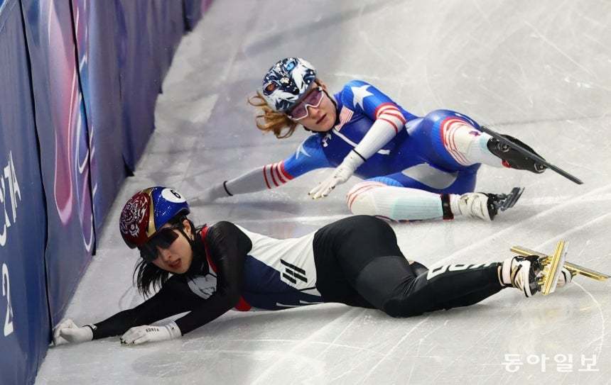 김길리가 10일(현지 시각) 이탈리아 밀라노 아이스스케이팅 아레나에서 열린 올림픽 쇼트트랙 혼성 계주 준결선에서 미국 선수에 걸려 넘어지고 있다. 밀라노=전영한 기자 scoopjyh@donga.com