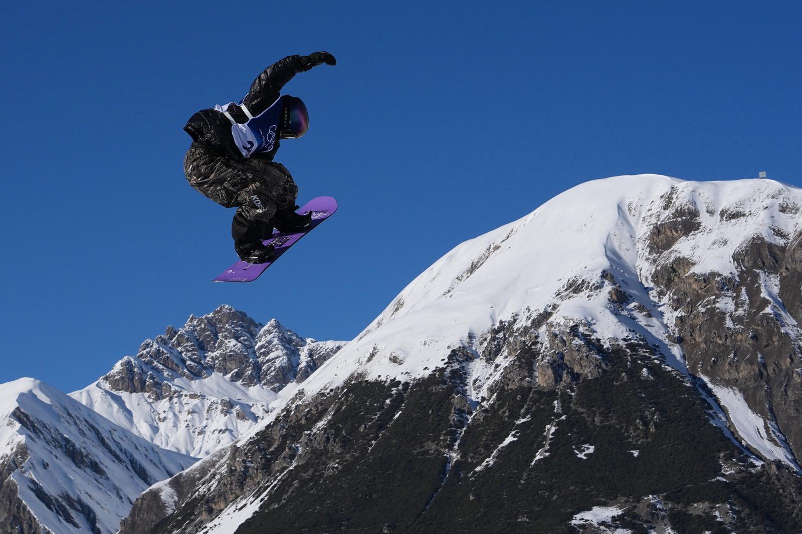 유승은이 15일 슬로프스타일 공식훈련에서 점프를 하고있다. 뒤로 알프스 산맥이 보인다. 리비뇨=AP 뉴시스