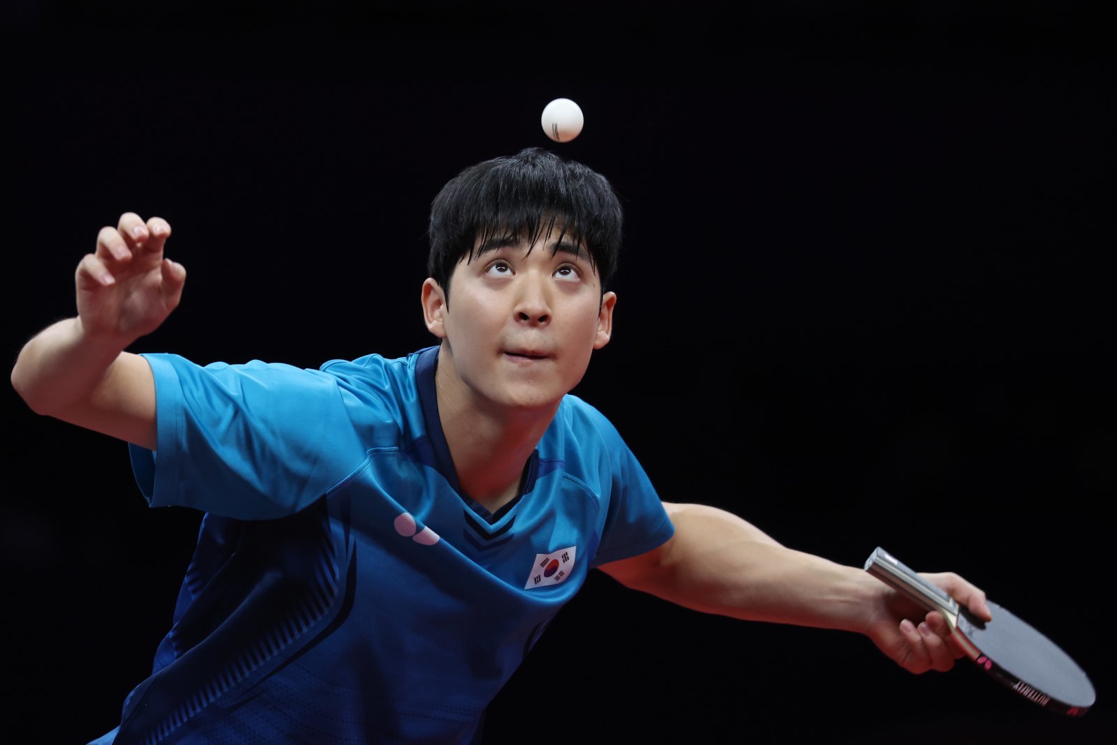26일 중국 궁수 커낼 스포츠파크에서 열린 2022 항저우 아시안게임 남자 탁구 단체전 결승전 한국 대 중국 경기, 3세트 한국 박강현이 서비스를 하고 있다. 2023.09.26 뉴시스