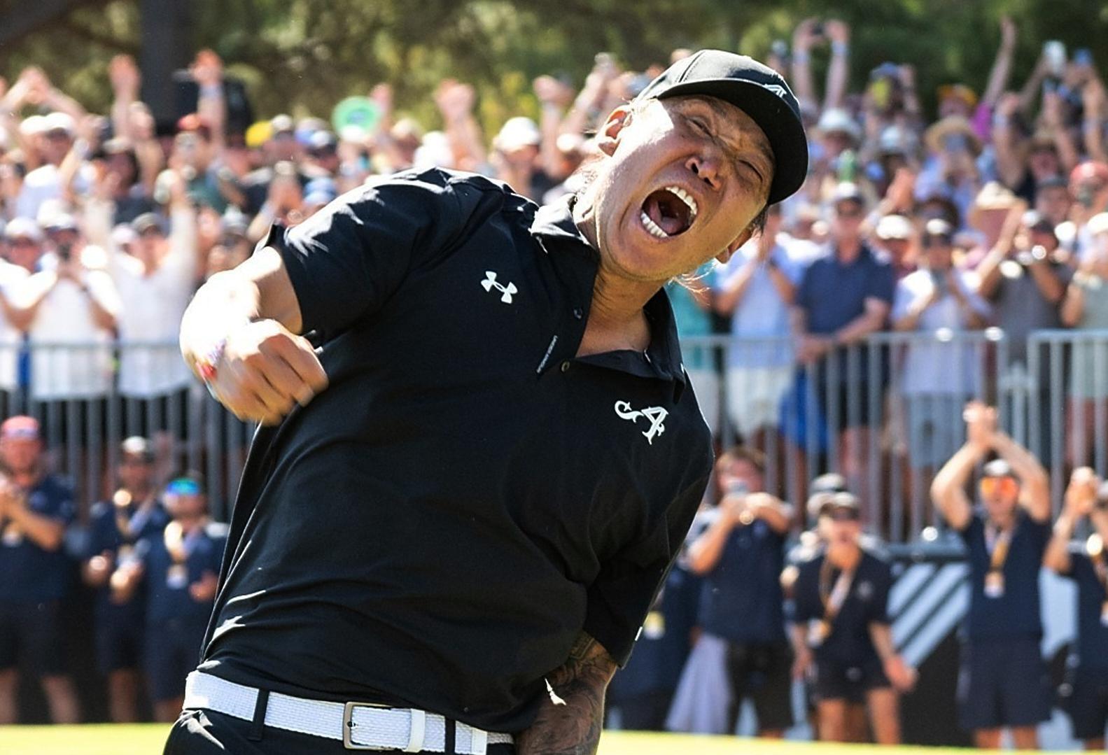 앤서니 김이 15일 끝난 LIV골프 애들레이드 최종 4라운드 18번홀에서 챔피언 퍼트에 성공한 뒤 환호하고 있다. 앤서니 김은 미국프로골프(PGA)투어 소속이던 2010년 휴스턴 오픈 우승 이후 16년 만에 우승 트로피를 들어 올렸다. 애들레이드=AP 뉴시스