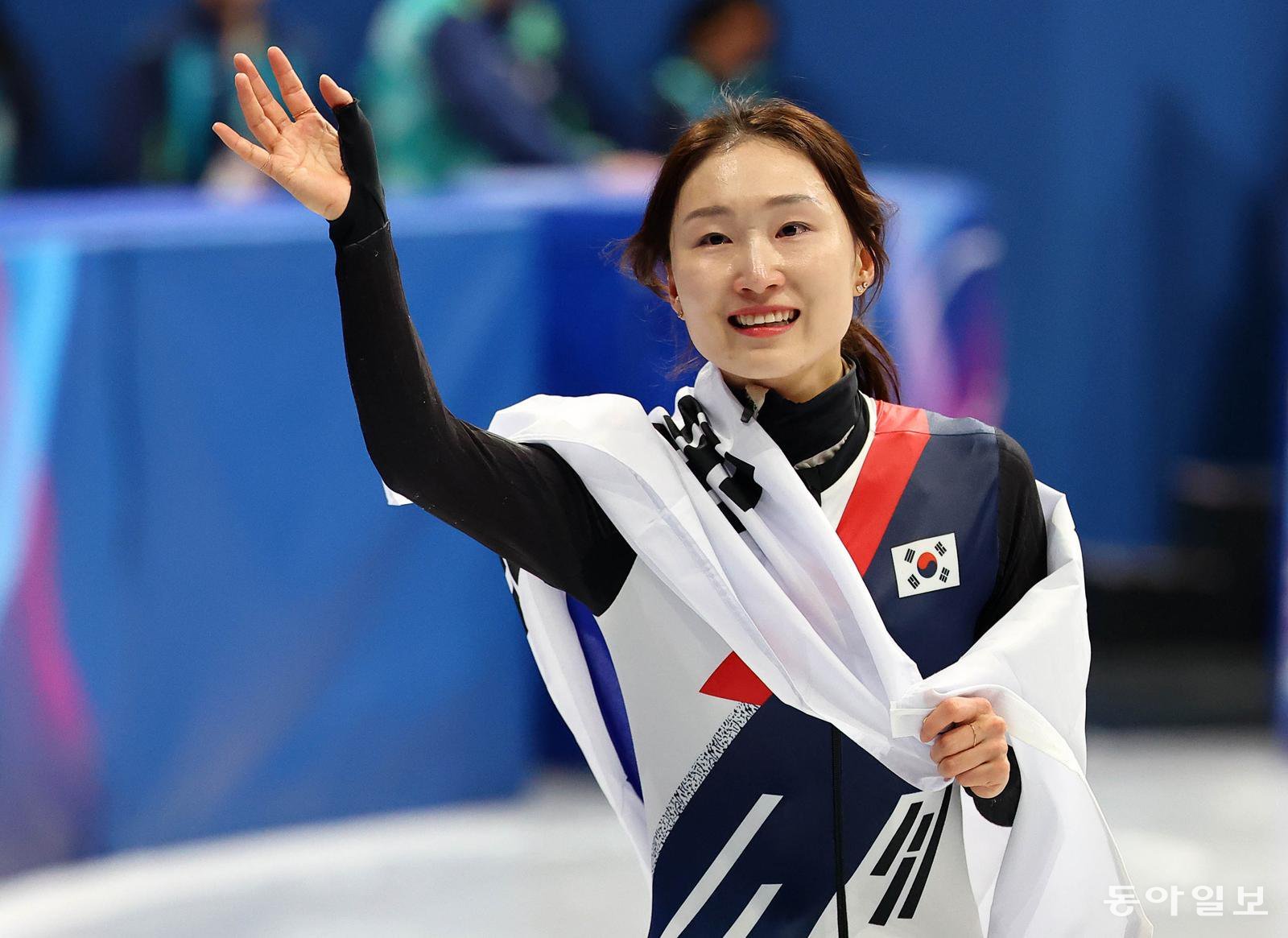 ‘쇼트트랙 여왕’ 최민정이 21일 열린 2026 밀라노-코르티나담페초 겨울올림픽 쇼트트랙 여자 1500m 결선에서 은메달을 딴 뒤 태극기를 몸에 두른 채 관중들에게 인사하고 있다. 밀라노=전영한 기자 scoopjyh@donga.com