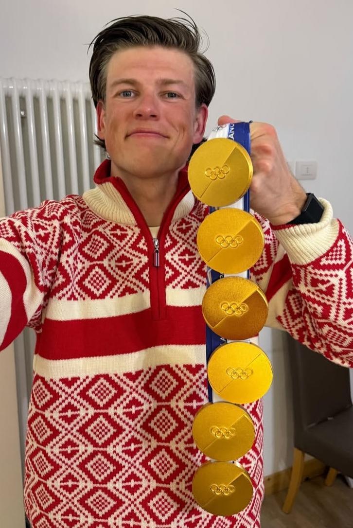 2026 밀라노-코르티나담페초 겨울올림픽에서 따낸 6개의 금메달을 들어 보이고 있는 노르웨이 크로스컨트리 스키 대표 요한네스 회스플로트 클레보. 대회 6관왕에 오른 클레보는 통산 11개의 금메달을 수집해 역대 겨울올림픽 최다 금메달의 주인공이 됐다. 사진 출처 클레보 인스타그램