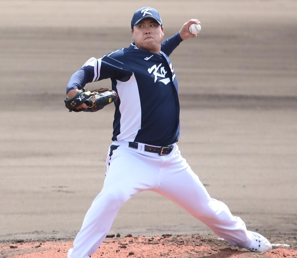 한국 야구대표팀 선발 투수 류현진이 21일 일본 오키나와현 시마지리의 고친다구장에서 열린 소속팀 한화와의 연습경기에서 역투하고 있다. 류현진은 이날 2이닝 동안 상대 타자를 한 번도 출루시키지 않는 ‘퍼펙트 피칭’을 기록했다. 한화 제공