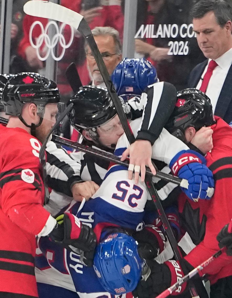 관세 전쟁보다 뜨거운 주먹다짐이 빙판 위에서 벌어졌다. 미국과 캐나다 남자 대표팀 선수들이 22일 이탈리아 밀라노 산타줄리아 아레나에서 열린 2026 밀라노-코르티나담페초 겨울올림픽 남자 아이스하키 결승 경기 도중 몸싸움을 벌이고 있다. ‘아이스하키 양강’으로 평가받는 미국과 캐나다의 이날 대결은 ‘관세 전쟁’ 여파까지 더해져 큰 관심을 모았다. 경기에선 미국이 연장 접전 끝에 캐나다에 2-1로 승리하고 46년 만에 올림픽 금메달을 거머쥐었다.