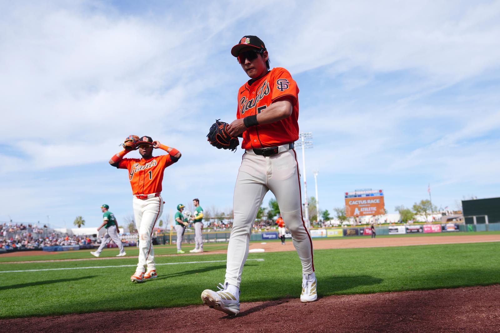샌프란시스코 자이언츠의 이정후가 23일(현지 시간) 미 애리조나주 스코츠데일 스타디움에서 열린 애슬레틱스와 시범 경기 4회 수비를 마친 후 더그아웃으로 돌아오고 있다. 2026.02.24.[스코츠데일=AP/뉴시스]