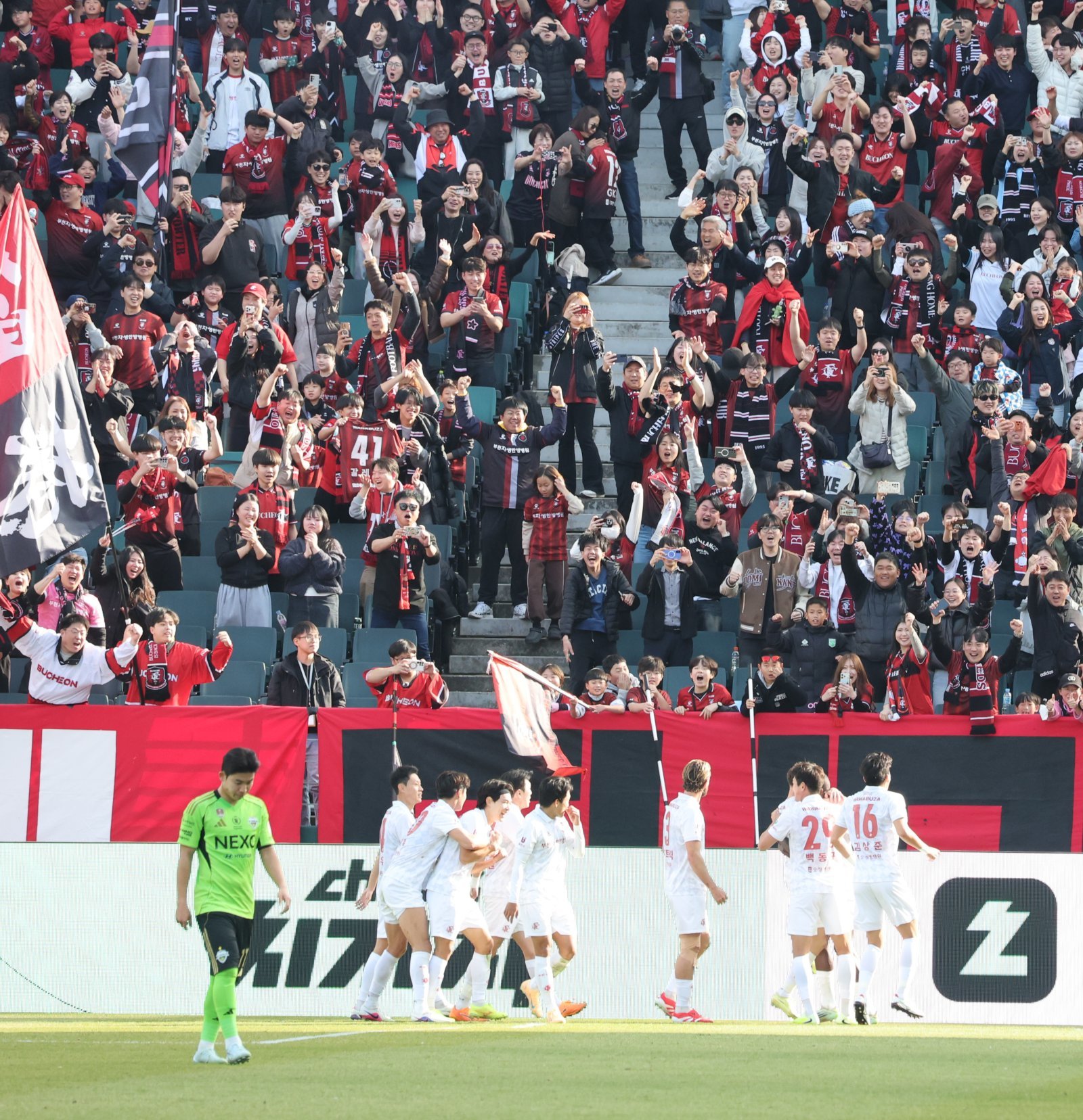 프로축구 부천 선수들이 1일 전북 전주월드컵경기장에서 열린 전북과의 2026시즌 K리그1 경기에서 승리한 뒤 구단 공식 서포터스인 ‘헤르메스’가 모여 있는 관중석으로 다가가 창단 후 첫 1부 승리의 기쁨을 함께 나누고 있다. 2007년 창단해 이날 처음 K리그1 경기에 나선 부천은 ‘디펜딩 챔피언’ 전북을 3-2로 꺾는 이변을 연출했다. 전주=뉴스1