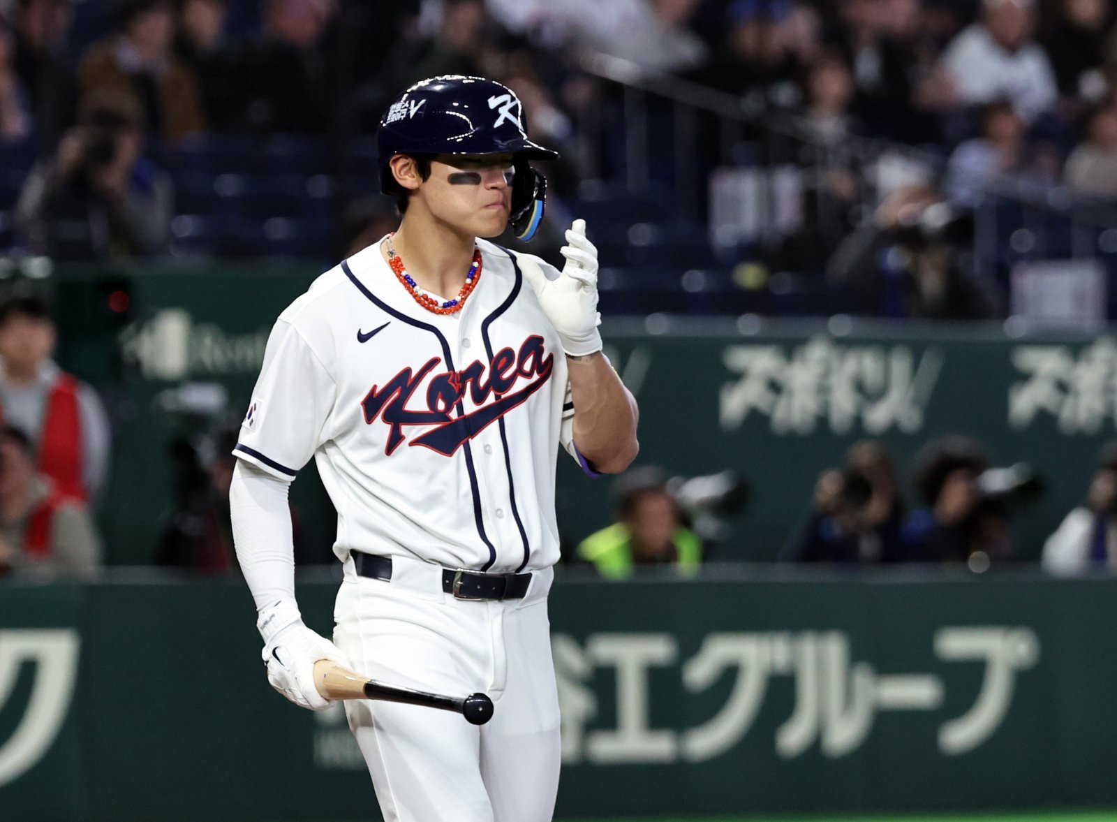 5일 오후 일본 도쿄돔에서 열린 2026 월드베이스볼클래식 C조 1차전 대한민국과 체코의 경기. 대한민국의 4회말 1사 주자없는 상황때 김주영이 삼진아웃 당한 뒤 타석에서 물러나고 있다. 2026.3.5. 뉴스1