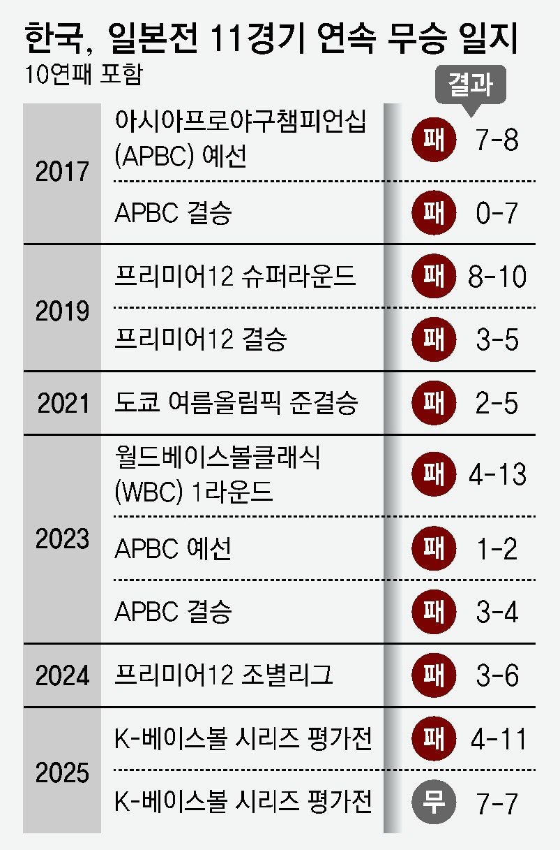 성인 대표팀 맞대결에서 한국 야구가 일본을 꺾은 건 2015년 세계야구소프트볼연맹(WBSC) 프리미어12 준결승에서 4-3으로 역전승한 게 마지막이다. 이후 일본과 11번 맞붙어 1무 10패를 기록 중이다. 지난해 11월 16일 도쿄돔에서 열린 K-베이스볼 시리즈 2차전을 7-7 무승부로 마무리하면서 11연패를 피한 게 그나마 다행이었다.