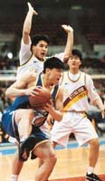전반 중반까지는 접전. 지난달 23일 6강리그에서 연세대를 침몰시켰던 경희대는 스피드를 앞세운 벌떼농구로 연세대를 괴롭혔다. 경희대는 윤영필이 연세대 서장훈을, 양은성이 주포 조상현을 전담마크하고 윤영필과 김성철이 골밑을 잇달아 돌파하며 기세를 올렸다.