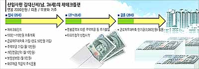 LG전자 해외홍보실의 김대신(金大信·26)씨. 입사한지 3개월 밖에 안된 새내기 직장인이다. 지금까지는 여기저기 쓰느라 돈을 모을 생각조차 못했다. 이달부터 저축도 하고 나름대로 재테크에 뛰어들 생각이지만 뭘 해야할지 딱히 잡히는게 없다. 재테크 전문가들에게 김씨의 상황을 설명하고 재테크 플랜을 짜줄 것을 요청했다.