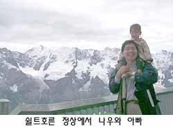 산을 좋아해서, 자고 있는 나우를 들쳐 안고 새벽 5시 기차로 서둘렀건만, 가는 방법이 어찌나 복잡하던지요. 인터라켄까지 기차 타고 가서, 케이블카, 버스, 다시 케이블카를 갈아타고 쉴트호른에 오른 시각이 오전 9시. 그나마 시간이 일러서인지, 운 좋게 창가의 빈자리를 찾아 앉았습니다.