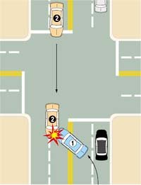 따라서 교차로에서 좌회전하는 자동차가 교차로에 이르기 전에 미리 중앙선을 넘었다가 맞은 편에서 오는 자동차와 충돌한 경우 중앙선을 넘은 자동차 ①이 ’중앙선 침범’으로 가해 차량이 된다.