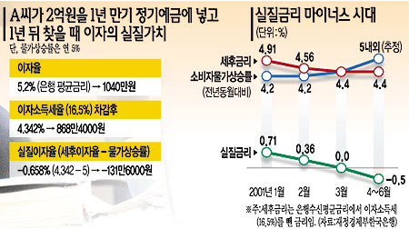 15일 한국은행과 금융권에 따르면 2·4분기 소비자물가 상승률이 5%대에 육박할 것으로 예상되는데 비해 은행권 수신평균금리는 2월 5.43%에서 3월과 4월에는 5.2%에서 5.3%까지 떨어질 전망이다. 이 경우 이자소득세(16.5%)를 떼고 나면 세후 이자는 4.4%에 그치게 되며 5%에 육박하는 물가상승률을 감안할 경우 실질금리는 마이너스가 될 수밖에 없다.