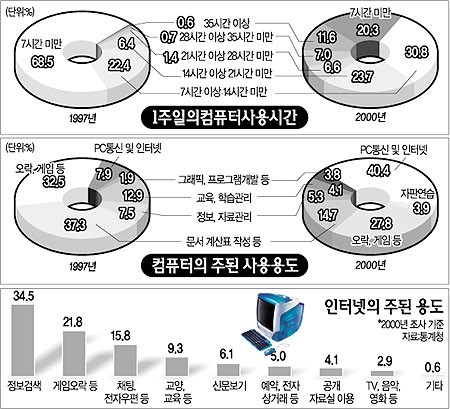 PC통신 및 인터넷의 용도는 정보검색이 34.5%로 가장 많았고 게임 오락 등 21.8%, 채팅 전자우편 등 15.8%, 교양 교육관련 9.3%, 신문보기 6.1%였다.