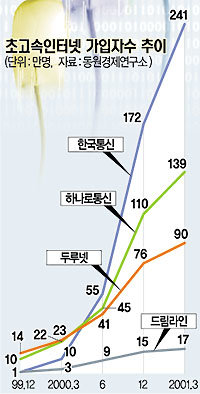 초고속인터넷 전문업체인 하나로통신과 드림라인은 가입자수가 급증하면서 1·4분기 매출액이 전년 동기 대비 376.1%나 늘었다. 그러나 순이익은 지난해보다 악화된 657억원의 적자를 기록했다. 양 수석연구원은 “영업손실은 줄었으나 이자빚이 더 늘어나 순손실 폭이 증가했다”고 분석했다.