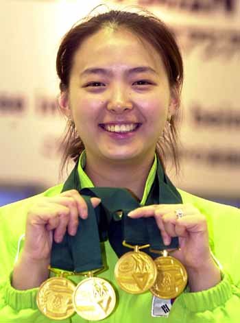 제3회 오사카 동아시아경기대회에서 볼링 4관왕을 차지한 남보라양이 메달을 보여주며 환하게 웃고 있다.「연합」