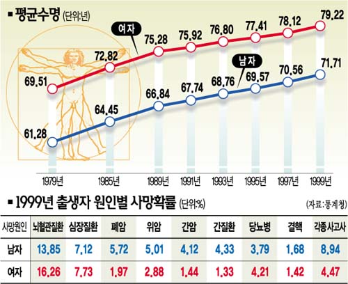 ▽여자가 남자보다 7.5년 오래 산다〓생명표에 따르면 1999년 현재 한국인의 평균수명은 75.6세로 10년 전인 1989년(70.8세)보다 4.8년, 20년 전인 1979년(65.2세)보다 10.4년이나 늘었다.