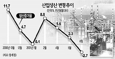 통계청은 27일 내놓은 ‘6월중 산업활동 동향’에서 지난달 산업생산활동이 작년 6월보다 2.7% 줄었다고 밝혔다.