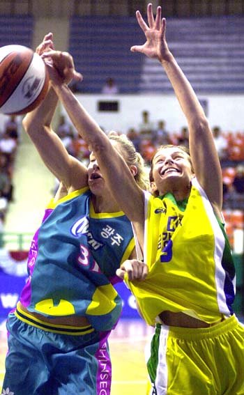 3일 장충체육관에서 벌어진 여자프로농구. 신세계 안다(왼쪽)와 현대 엠마가 골밑에서 리바운드 볼을 다투고 있다.