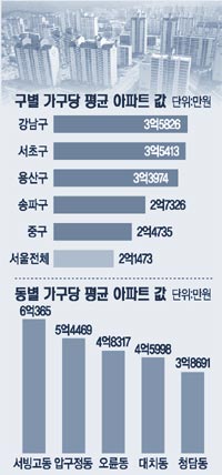 ▽강남권 아파트값이 서울의 절반 육박=강남 서초 송파 강동 등 강남권 아파트 값은 79조5151억원. 이는 서울 전체 아파트값의 44%다. 강남권에 고급 주상복합 아파트가 잇따라 들어서고 있어 내년 말이면 강남권 아파트값이 서울 전체의 절반에 이를 전망이다.