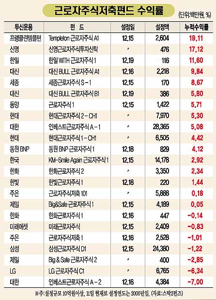 신상품은 판매사(증권 또는 은행)는 한 곳으로 정하되 5000만원 이내에서 다양한 펀드를 고를 수 있다. 따라서 투자금액을 쪼개 2, 3개 펀드에 나눠 넣으면 변동성이 큰 데서 오는 위험을 조금 줄일 수 있다. 또 투자자들은 신상품과 비슷한 근로자주식저축펀드의 운용수익률을 보고 운용사를 고르는 게 낫다(그래프 참조). 작년 말까지 판매된 근로자주식저축펀드는 주식 비율이 50% 이상으로 나머지 50%는 채권 등에 투자해 변동성을 줄일 수 있었다.