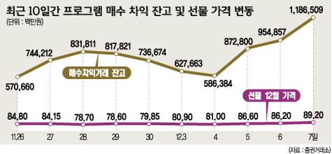 ▽이번 주 전망〓지난해 1월과 7월에도 1조4000억원과 1조2000억원의 프로그램매수 금액이 쌓인 적이 있었다. 그러나 당시에는 선물 만기일이 2개월 정도 남아 있어 청산도 천천히 이뤄져 큰 충격이 없었다. 그러나 1조2000억원을 쌓아두고 만기일 주간을 맞은 적은 이번 주가 처음이다.