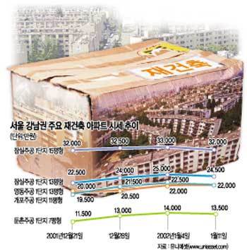 정부는 재건축 바람이 불고 있는 아파트에 대해 기준시가를 수시로 조정하기로 했다. 여기에 대부분 아파트의 재건축 진행이 초기 단계에 머물러 있는 점도 가격 약세를 부추길 수 있다. 가격 폭등에 따른 경계심리까지 퍼져 거래 단절이 봄까지는 지속될 것으로 중개업계는 내다보고 있다.