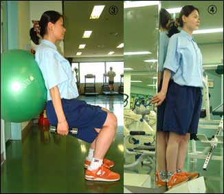 ③벽에 댄 공에 등을 기대고 양발은 어깨 너비로 벌린 뒤 양손에는 아령을 든다. 무릎이 90도가 될 때까지 천천히 굽히는 것을 15회 실시하고 쉬기를 3회 되풀이한다.