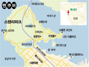 스탠리 파크는 밴쿠버 도심 한복판에 있다. 도시에 있는 산이나 숲 중에선 지구 최대의 원시림으로 꼽힌다. 도심 속 밀림인 셈이다. 스탠리 파크를 비롯해 밴쿠버 일대의 산과 숲을 지켜내는 것은 시민의 힘이다. 작게는 스탠리파크 보존 기금을 내는 것부터 크게는 적극적인 산림 법안 마련에 이르기까지.