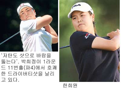 ‘코알라’ 박희정(22·CJ39쇼핑)과 한희원(24·휠라코리아), 장정(22·지누스)은 나란히 2언더파 69타를 마크, 144명의 출전선수 중 공동 4위에 랭크됐다. 단독선두(4언더파 67타) 레이첼 테스키(호주)에 불과 2타 뒤진 성적. 반면 대회 2연패 겸 이 대회 통산 4번째 우승에 도전하는 박세리(25)는 공동 43위(1오버파 72타)로 부진한 출발을 보였다. 올 시즌 개막전인 다케후지클래식 3위 이후 눈에 띄는 성적을 내지 못했던 박희정은 이날 드라이버샷 호조(페어웨이 적중률 100%)에 힘입어 버디 3개와 보기 1개를 기록했다.