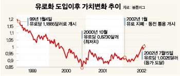 ▽유로화 강세 엇갈리는 명암〓유럽의 전반적인 반응은 유로화 상승을 반기는 분위기. 인플레 퇴치를 최우선 경제정책으로 삼고 있는 유럽 국가들은 유로화 강세로 인해 원유 에너지 등 주요 수입품목의 가격이 하락하면 물가 상승을 억제하고 소비자들의 지출을 늘릴 수 있기 때문이다. 게다가 인플레가 억제되면 유럽중앙은행(ECB)이 금리인상을 단행할 이유가 없어지며 따라서 경제성장에도 희소식이 아닐 수 없다.