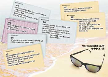 외환카드도 8월15일까지 강원 낙산해수욕장의 일부를 ‘외환카드 쿨 존’으로 지정한 뒤 회원들에게 야영장 주차장 샤워시설을 무료로 제공한다. 비씨카드는 7월27일∼8월14일 동해 망상해수욕장에 회원 전용캠프를 마련한다. 참가신청은 홈페이지(bccard.co.kr)에서 가능.
