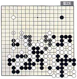<장면도> 보시다시피 백은 우하귀 흑대마를 일찌감치 시식한 상황. 따라서 흑1로 시비를 걸어왔을 때 <참고도>처럼 백2~6으로 알기 쉽게 처리했으면 압승이었다. 흑5로 백 일곱 점을 주는 정도는 이제 와선 껌값.