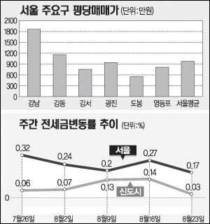 8월 넷째 주 전세금 상승률(전 주 대비)은 서울 0.17%, 신도시 0.03%, 서울과 신도시를 뺀 수도권 0.19%였다.