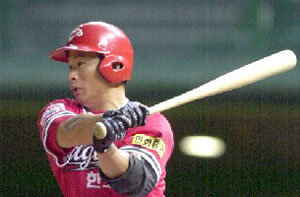 송지만은 24일 대구에서 열린 삼성증권배 프로야구 삼성전에서 9회초 오른쪽 담장을 넘어가는 솔로 아치를 그려 시즌 32호 홈런을 기록했다. 멀찌감치 치고 나간 삼성 이승엽(37개)에 비해 5개 뒤진 2위. 그러나 한화가 삼성에 비해 4경기나 더 남아 있는데다 몇 번의 몰아치기만 한다면 충분히 재역전도 가능하다.