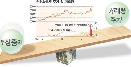 무상증자 소식으로 16일 상한가를 나타내며 거래량이 급증한 신영와코루, 유통물량이 모자라기로 악명 높았지만 주가가 4만원을 넘어서며 본격적으로 거래가 늘어난 동서 등도 모두 비슷한 사례다.