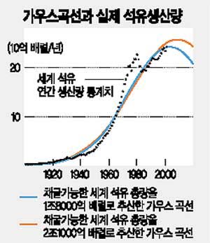 마:그러니까, 그의 예언을 ‘세계 석유 생산량’에 대입하면 2003∼2008년 최고에 이른 후 줄어들 수 밖에 없다?