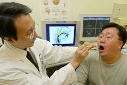 삼성서울병원 신경과 홍승봉 교수가 심한 코골이로 찾아온 권병하씨의 목젖부위를 검사하고 있다.