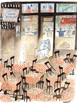 ‘꼬마 니콜라’의 삽화가로 유명한 장 자크 상페가 강박증에 사로잡힌 현대인의 일상을 뒤집어서 때로는 유머감각 넘치게, 때로는 짙은 페이소스를 담아 표현했다. 폭탄테러 신고가 접수된 듯 잔뜩 긴장감이 감도는 뉴욕의 프랑스 음식점. 그러나 범인은? 담배 한 개비 때문에 급하게 손님들을 내보내고 소방차까지 동원한 해프닝으로 두 나라의 문화 차이를 풍자했다.