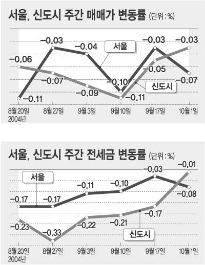 신도시에서는 분당(―0.09%), 일산(―0.05%)의 전세금이 약보합세였다. 일산 백석동 백송대우 27평형은 500만원 떨어진 9000만∼1억500만원 선. 산본(0.10%), 평촌(0.06%)은 소폭 올랐다.