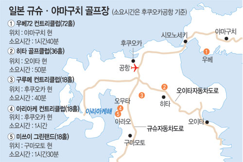 이들 골프장은 후쿠오카 공항에서 자동차로 40분∼1시간40분 거리에 있다. 미쓰이 그린랜드의 경우 테마파크도 갖추고 호텔(베르데)도 있어 가족 동반 여행지로 좋다. 우베컨트리클럽은 일본 10대 명문코스로 만넨이케 동코스는 1999년 최경주 선수가 우승한 JPGA 우베고산대회의 고향.