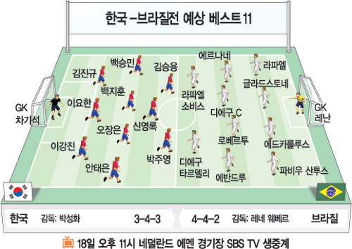 박 감독이 수비 안정을 위해 꺼낸 카드는 스리백. 스위스와의 1차전, 나이지리아와의 2차전 모두 포백으로 나섰다가 잘 먹혀들지 않아 경기 도중 스리백으로 바꿔 큰 효과를 봤기 때문이다. 이강진(도쿄 베르디)-이요한(인천)-김진규(주빌로 이와타)가 스리백을 이루고 수세 땐 양쪽 측면 미드필더인 백승민(연세대)과 안태은(조선대)까지 수비진에 가세해 브라질의 공격을 차단할 계획.