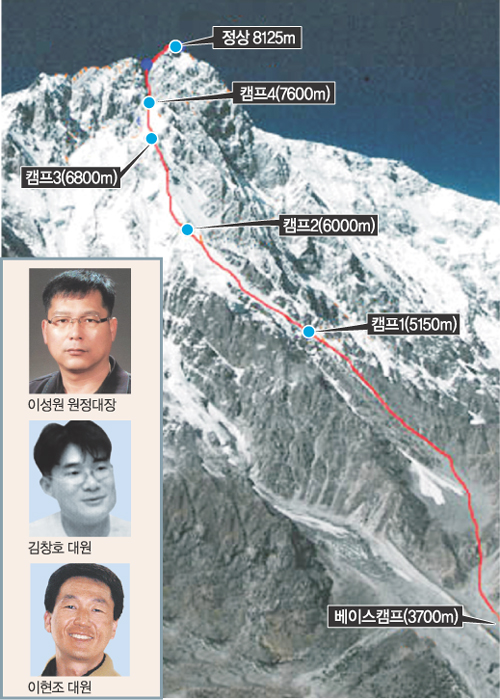 원정대는 4월 20일 베이스캠프(3700m)를 세운 뒤 캠프1(5150m), 캠프2(6000m)를 천천히 구축해 나갔다. 원정대는 지난달 21일 캠프4를 구축해 26일 드디어 1차 시도에 나섰으나 낙석으로 김미권(33) 대원이 오른 다리에 금이 가는 부상을 입어 다시 후퇴해야 했다.